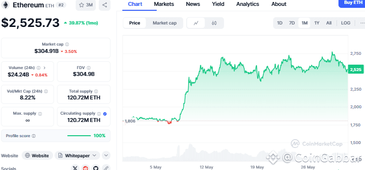 The announcement comes during a downward trend for ETH in the crypto market. It fell by nearly 3.43% in the last 24 hours, trading around $2,525. It had reached a high of $2,649 earlier but couldn’t hold it. Many traders are watching the $2,500 mark to see if prices drop more or start to recover. Looking at the monthly chart of Ethereum it has experienced an increase of 39.08% as per the CoinMarketCap.