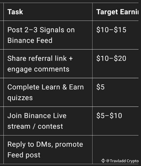 Step 4: Live Binance Events and Challenges I joined public competitions, Q&A sessions, and live events - and earned rewards for my participation. 💬 Be active in the chat = more visibility = more opportunities. --- 🚨 Bonus: Stay consistent in following Binance news I posted daily. I interacted with others. I commented on trending posts. The algorithm noticed. More reach, more followers, more rewards. --- 📆 My one-day strategy practically: Task: Time frame, target profit Morning post: Two or three signals on the Binance feed: $10-15 Noon: Share referral link + interact with comments: $10-20 Afternoon: Complete learning and earning quizzes: $5 Evening: Join the live stream/Binance competition: $5-10 Evening: Respond to private messages, promote brief post: $10 or more