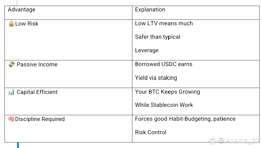 Instead of letting BTC sit idle, I use it as collateral to borrow USDC, but I keep the Loan-to-Value (LTV) ratio low—around 27–28%. This gives me: