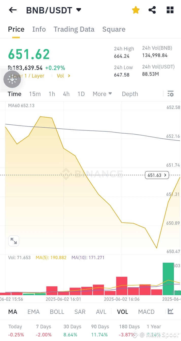 The BNB/USDT pair is trading at $651.62, reflecting a modest 0.29% uptick (Rs183,639.54). The 24-hour range shows a high of $664.24 and a low of $647.58, with a robust trading volume of 134,998.84 BNB and $88.53M USD.Price Trend: