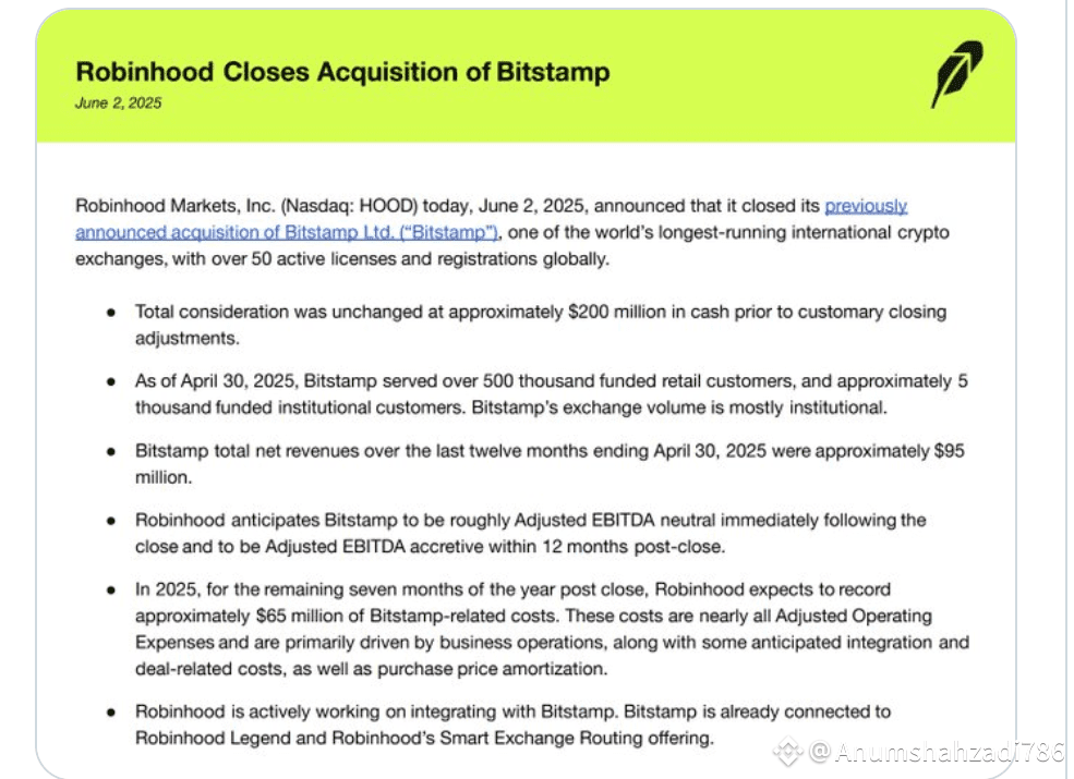 On June 2, 2025, Robinhood completed a dollar 200 million all-cash acquisition of Bitstamp, marking a significant strategic expansion into the global cryptocurrency market. This move gives Robinhood access to Bitstamp’s established infrastructure, regulatory licenses, and international user base, positioning it to compete more aggressively with major crypto exchanges. The acquisition highlights Robinhood’s commitment to deepening its presence in digital assets and signals a broader ambition to become a key player in the global crypto ecosystem.