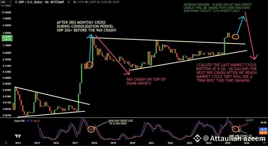 According to the expert’s chart analysis, XRP is mirroring its 2017 price structure, when a Bullish Stochastic RSI (SRSI) cross on the monthly time frame triggered a 20x price surge. Back then, XRP skyrocketed before crashing 96%, wiping out unsuspecting investors the analyst refers to as “dumb money.”