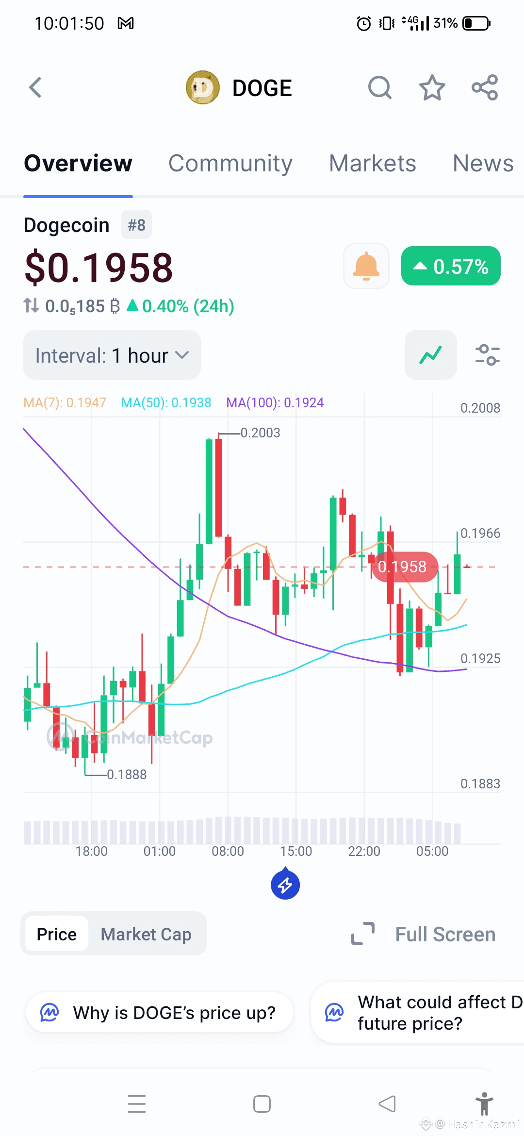 As of June 4, 2025, Dogecoin (DOGE) is trading at approximately $0.1957, reflecting a slight decline of 0.075% over the past 24 hours. The intraday high reached $0.1979, while the low touched $0.1932.