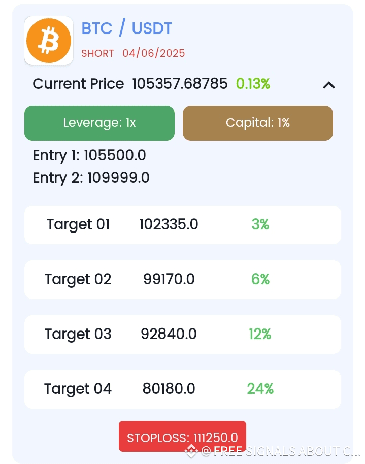 Aaj BTC ka price hai 105357.68 USDT, aur ek fresh short signal mil chuka hai jo market ke girne ka strong chance dikhata hai. Yeh signal un logon ke liye best hai jo low risk aur smart entry ke sath profit lena chahte hain.