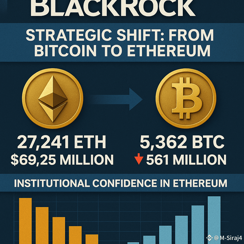 BlackRock, the world's largest asset manager, has significantly increased its investment in Ethereum (ETH), purchasing approximately 27,241 ETH valued at around $69.25 million. This move coincided with the sale of 5,362 BTC worth $561 million, indicating a strategic shift from Bitcoin to Ethereum.