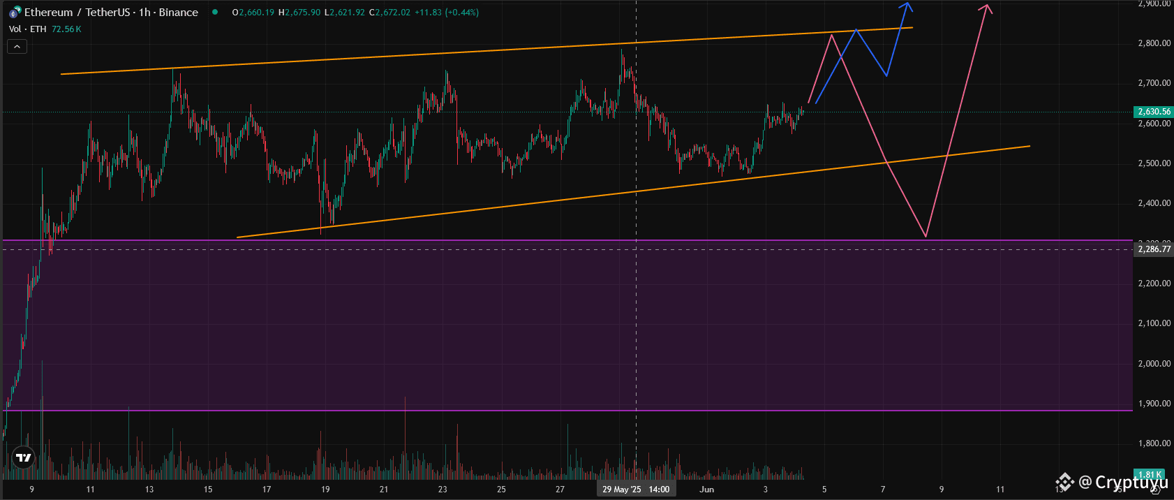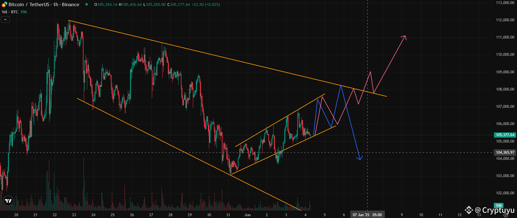 On this 1-hour chart, the current upward sloping channel is actually leading to the top of a large downward sloping channel. BTC may reach 108K in the short term, possibly around June 25, and then two possibilities emerge from there: