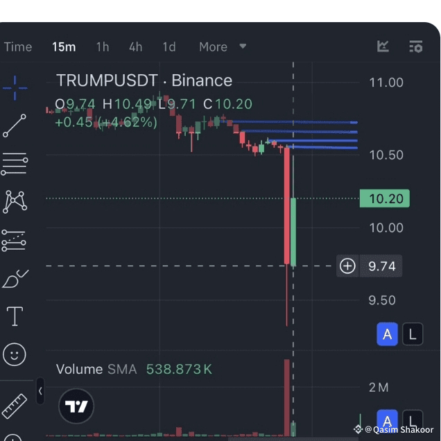 After a sharp sell-off, $TRUMP has bounced back impressively, currently trading near $10.20 with a +4.62% gain. The long wick on the latest candle highlights intense volatility, while bulls are pushing to regain control of the trend.