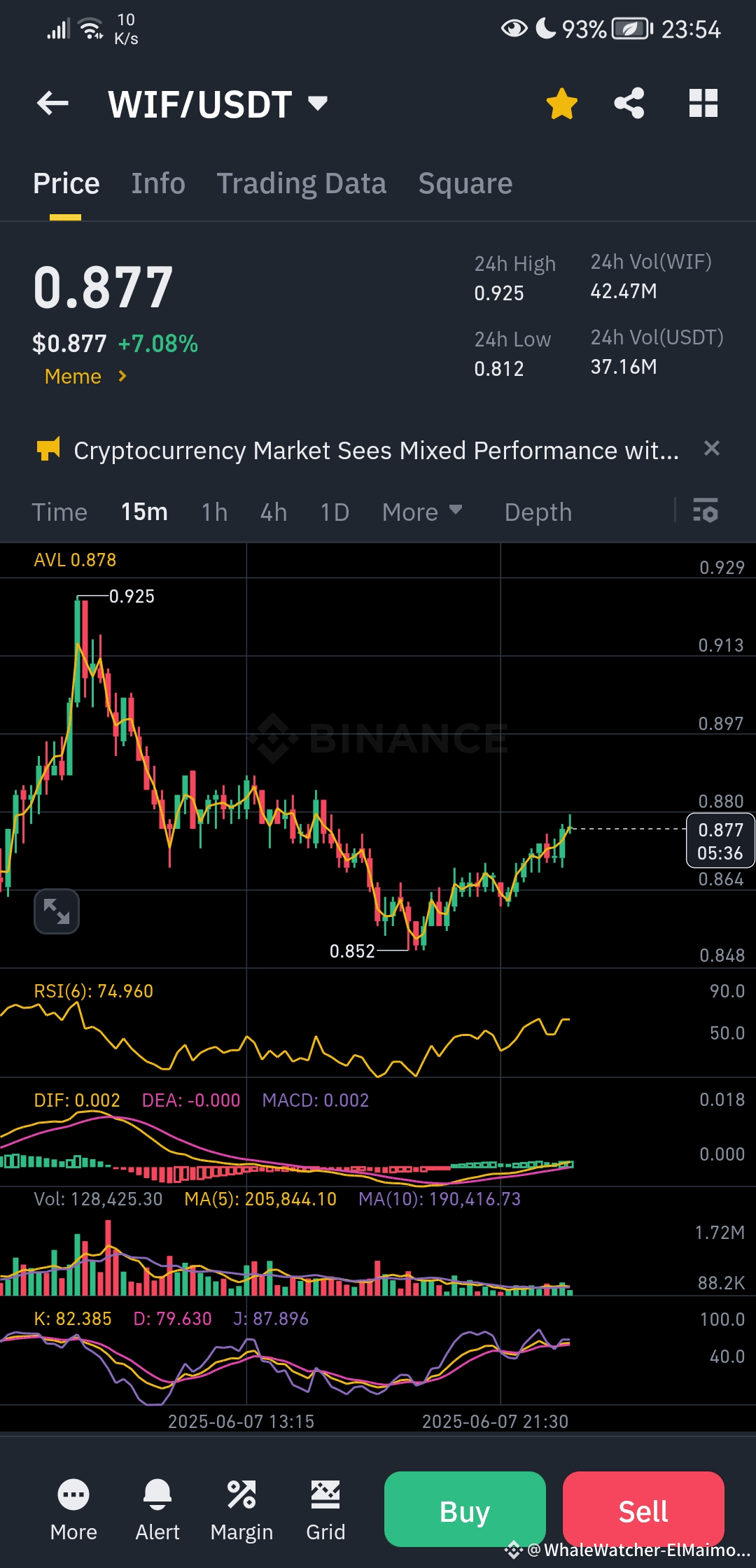 ✅ ارتداد ملحوظ! بعد تراجعه إلى $0.852، شهد WIF انتعاشًا سريعًا ليصل إلى $0.877 حاليًا، بارتفاع يومي قدره +7.08% – مما يدل على عودة قوية للثيران!
