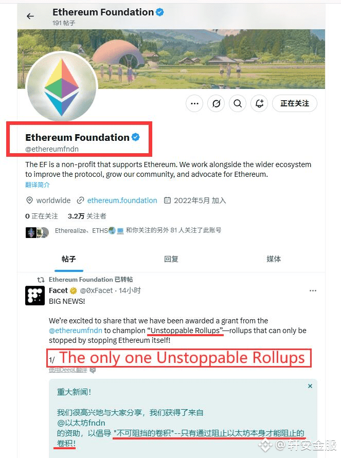 近期在以太坊扩容板块出现了一个全新的概念——Unstoppable Rollup,不可被关闭的汇总。下面我们详细聊聊“unstoppable rolluop”。 官网:https://unstoppablerollups.com一、什么是 Unstoppable Rollup?Unstoppable Rollup 并不是指某一个单一的 Rollup 项目,而是一种新的以太坊扩展范式与哲学定位,源于以太坊社区内部关于去中心化、抗审查性与数据可用性的深入讨论。简单理解:它是一类设计理念强调“不可被关闭 / 不可停止(unstoppable)”的 Rollup 类型。这种 Rollup 拒绝对中心化排序器的过度依赖,强调无需许可的运行机制和无需信任的数据可用性(DA),并优先保障用户在最极端情况下的“逃生”权利(exit games)。二、Unstoppable Rollup 的核心特征1. 抗审查(Censorship Resistance)节点无法随意拒绝用户提交交易,用户可以“强制包含”(force inclusion)。2. 无需许可的排序器(Sequencer)机制 不依赖于中心化的排序器,直接利用主网排序,降低中心化风险。3. 独立数据可用性(DA)机制支持 Layer1 以外的数据可用性解决方案,如 EigenDA、Celestia,或使用以太坊自身 calldata 实现数据保证。4. 可逃生性(Permissionless Exit)用户无论发生任何故障或攻击,都能从 Rollup 中自由退出、提取资产。三、为什么以太坊基金会支持 Unstoppable Rollup 路线?以太坊基金会在 Rollup 的研究方向上极为重视“去中心化原则”,即便牺牲部分效率,也要确保:·Rollup 不会变成中心化交易所的翻版·用户权益在极端情况下不会被锁死·扩展以太坊的同时,不损害其核心哲学因此,在众多 Rollup 架构中,Unstoppable Rollup 作为以“极限安全性与自由”为目标的范式,受到研究员和核心开发者的高度重视。四、Facet 协议与 Unstoppable Rollup 的结合意义1. Facet 是什么?Facet 是 Optimism 的一个分叉,它通过消除协议中的所有权限行为者,重新设计了卷积架构。在保留 OP Stack 大部分成熟功能的同时,Facet 引入了三项基本修改:·无权限排序:Facet 不依赖有权限的排序器,而是实现基于排序--允许任何参与者在 L1 上包含卷积块。 这样就无需集中选择排序器。 ·无合约排序:Facet 基于排序的作无需任何 L1 智能合约监督,消除了其他卷积中常见的升级载体。 这确保了特权合约不会被用来禁止交易处理。 ·原生gas token:Facet 没有像其他 OP Stack 公司一样使用桥接 ETH,而是推出了自己的gas token--Facet Compute Token (FCT)。 任何参与者都可以平等地获得这种原生资产(作为gas用途),从而无需特权桥接合约来管理 L2 的原生货币。2. Facet 的里程碑2023.12上线Facet V1,将铭文技术升级为全新的以太坊去中心化扩容方案。2024.11 Facet V2通过 zellic 审计。2024.12上线Facet V2,重新构筑底层协议,编程语言与以太坊一致,实现生态应用的无缝转移。 同时消除协议的中心化权限,成为一个真正意义的去中心化扩容方案。 2025.05 获得以太坊基金会资助,成为 Unstoppable Rollup 路线中唯一获得以太坊基金会资助的项目。