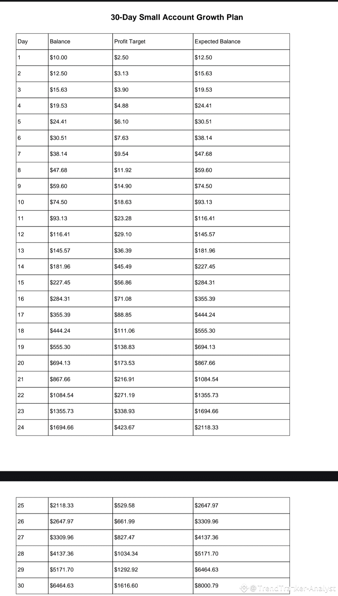 This is a structured money management strategy designed to grow a small trading account using consistent daily profit targets and the power of compounding.