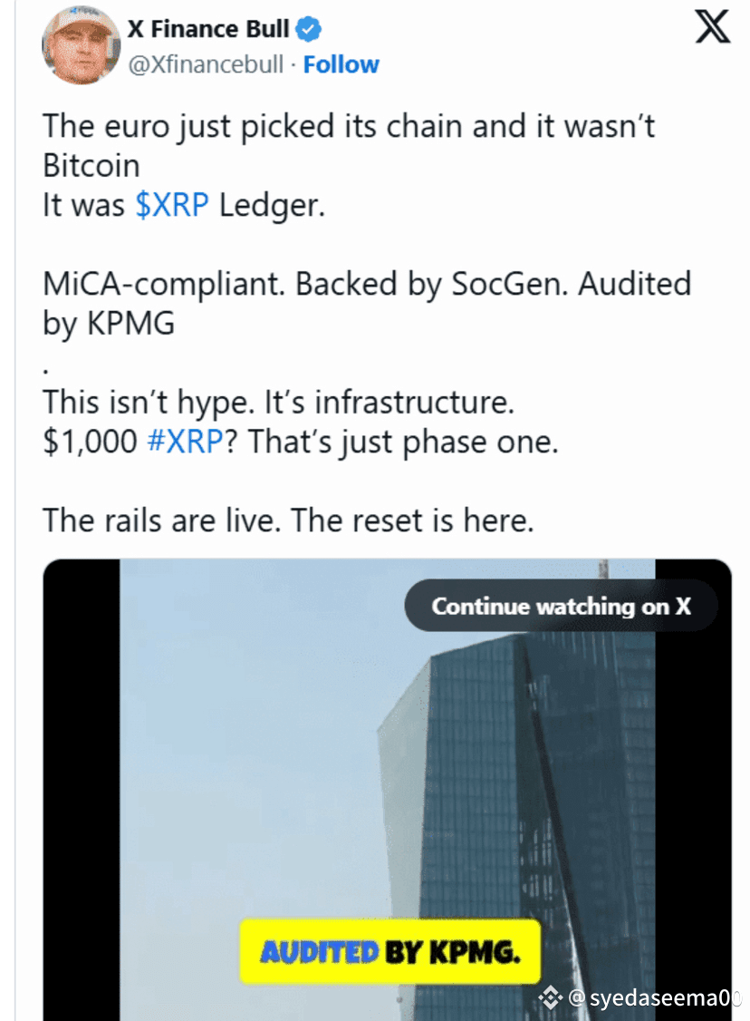 Another analyst, XFinanceBull, is on the same page. He points to EURØP, a new Euro stablecoin launching on the XRP Ledger and compliant with MiCA regulations — a strong sign XRP tech is being taken seriously for regulated financial use.