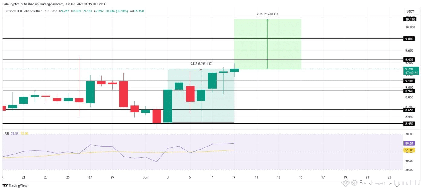 ارتفع سعر LEO بنسبة 9.7% خلال الأسبوع الماضي، ويتداول حالياً عند 9.29 دولار. المستوى القياسي لـ LEO هو 10.14 دولار، أي أعلى بنسبة 9.07% فقط من السعر الحالي. إذا ظلت ظروف السوق مواتية، فقد يدفع LEO نحو هذا المستوى أو حتى يتجاوزه، مما يشير إلى مستوى قياسي جديد محتمل.