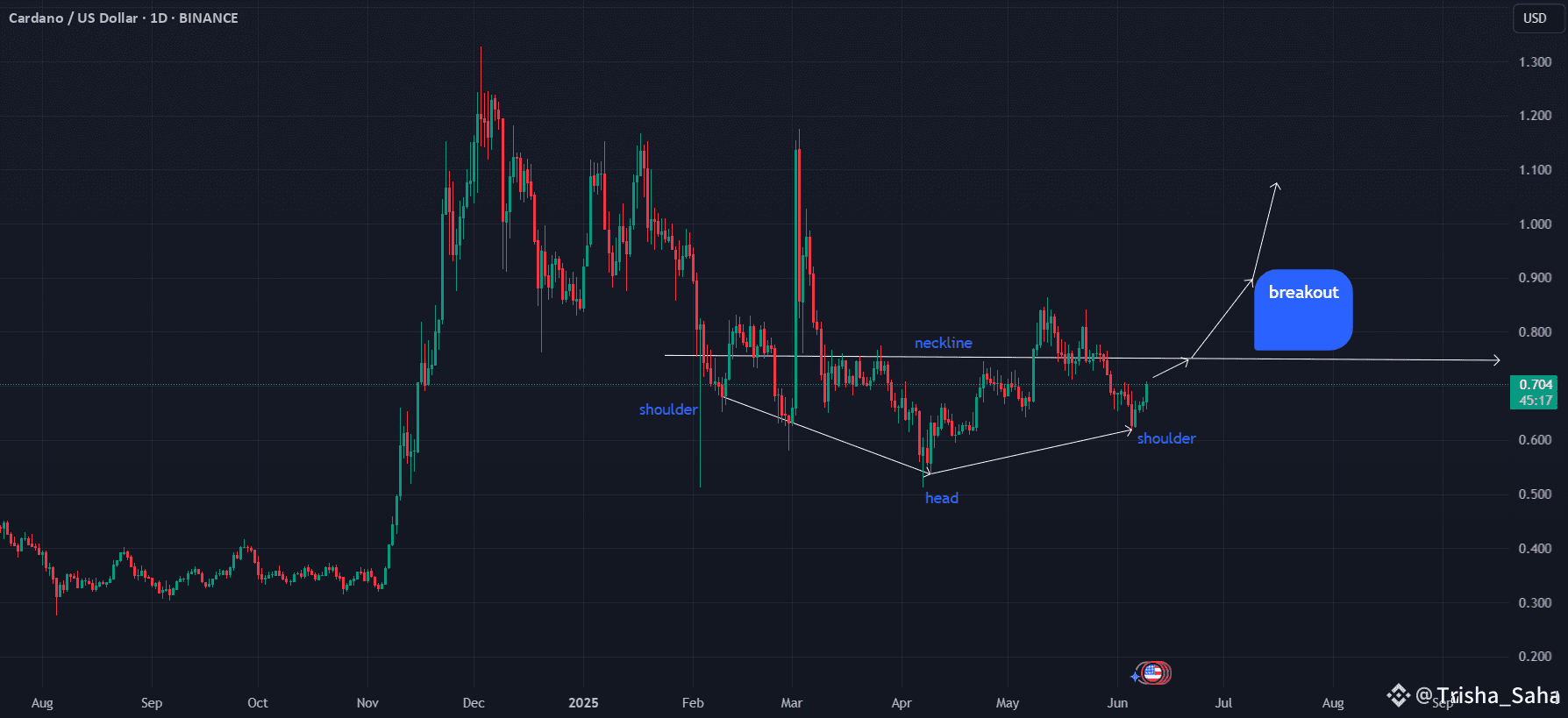 A classical Inverse Head & Shoulders pattern is forming on the daily timeframe of ADA/USDT on Binance. This is typically considered a bullish reversal pattern — especially after a prolonged downtrend or consolidation phase.