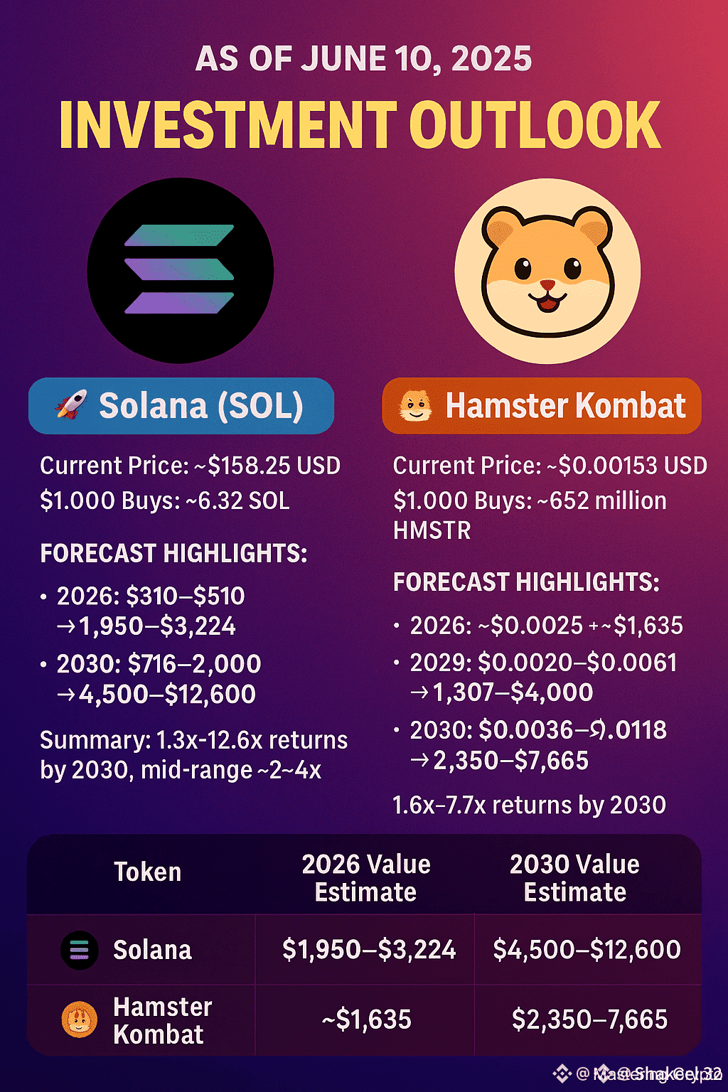 As of June 10, 2025, for a $1,000 investment in Solana (SOL) and Hamster Kombat (HMSTR), based on current prices and updated forecast models: