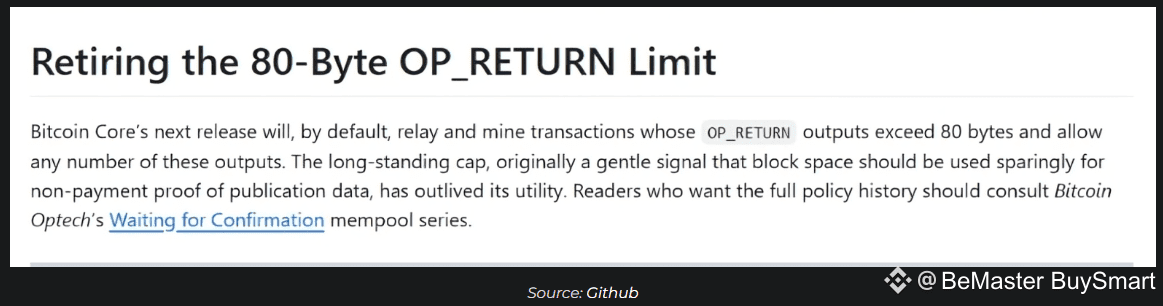 Prior to Core 30, these outputs were capped at 80 bytes, limiting on-chain inscriptions to ultra-small payloads. In practice, the limit has driven many projects to hack around the constraint or resort to off-chain storage solutions.