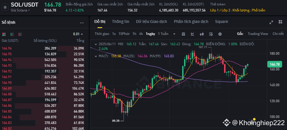Trong 24 giờ qua, Solana (SOL) đã ghi nhận mức tăng 5,23%, đạt mức giá 165,46 USD. Khối lượng giao dịch trong ngày đạt khoảng 1,82 tỷ USD, cho thấy sự quan tâm mạnh mẽ từ cộng đồng. Mức giá cao nhất trong ngày là 167,14 USD, thấp nhất là 156,89 USD.