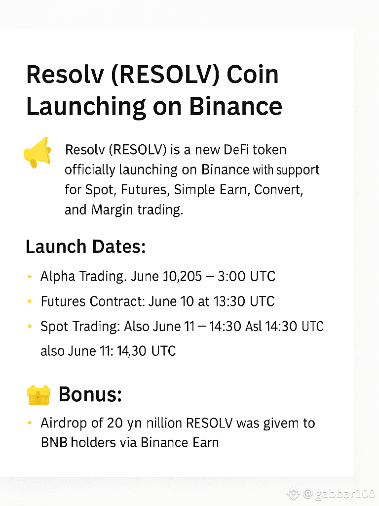 Resolv (RESOLV) is a new DeFi token officially launching on Binance with support for Spot, Futures, Simple Earn, Convert, and Margin trading.#BinanceHODLerRESOLV #BinanceHODLerRESOLV