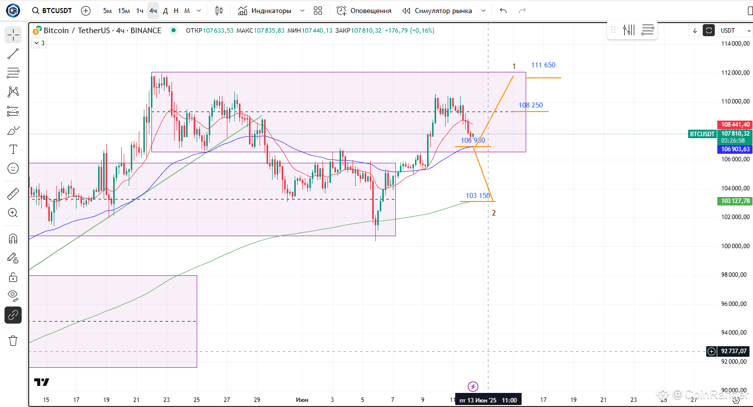 1️⃣Вариант разворота наверх. Прямо с текущих или примерно со 106 930 - это ема64 на h4 (синяя cредняя на графике) - можем развернуться наверх. Сыграть на руку такому вариант может, например, выходящий сегодня PPI. Тогда нашими целями будут 108 250 и 111 650. Последняя - если прям все пойдет совсем хорошо, и мы не услышим каких-нибудь заявлений от Трампа, в духе Си портит весь праздник и не хочет веселиться.