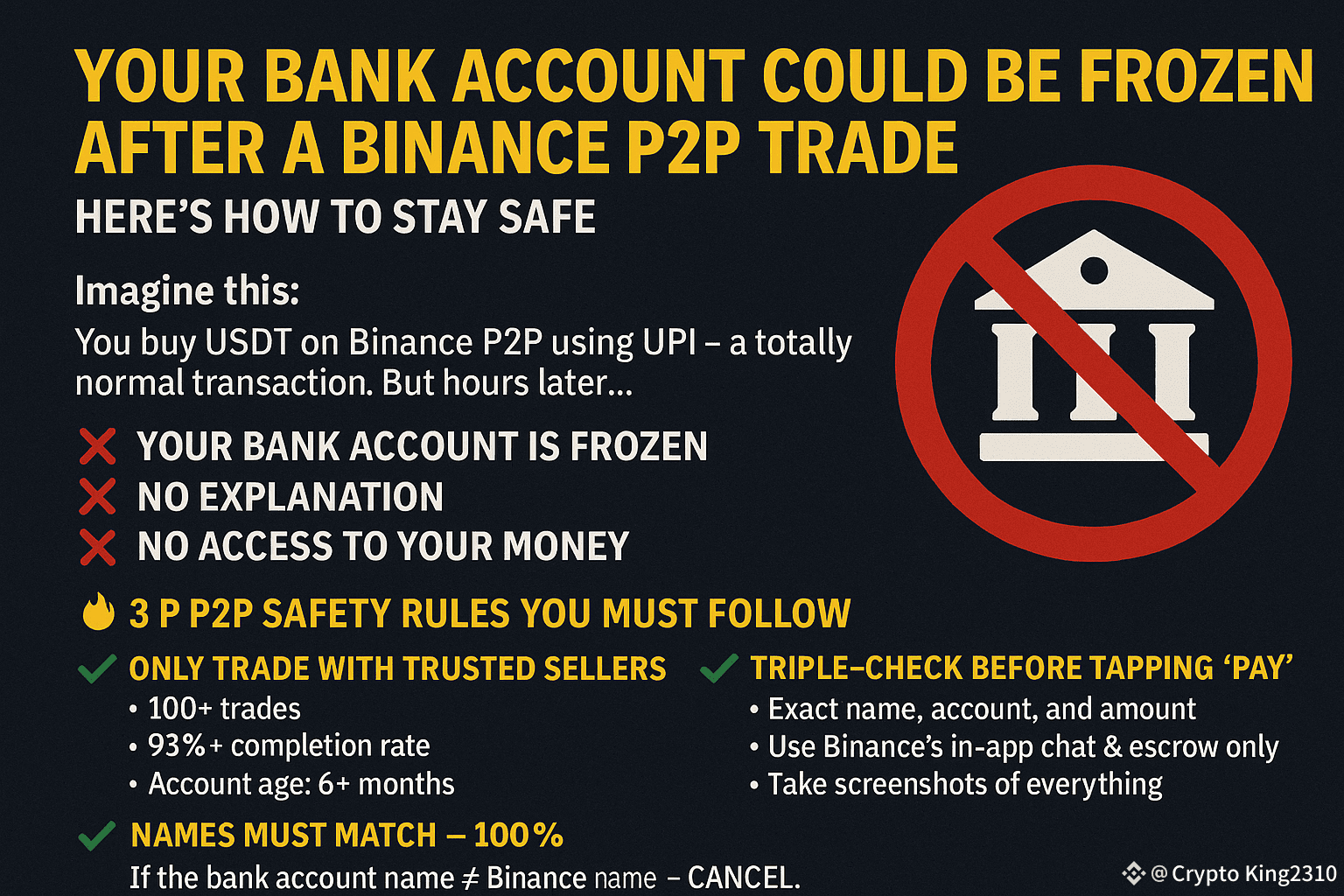 Here's How to Stay Safe 💸Imagine this:You buy USDT on Binance P2P using UPI — a totally normal trade.But within hours, your bank account is locked.❌ No warning❌ No reason given❌ No access to your own moneyThis happened to a close friend. 4+ months later, he’s still stuck — and it could happen to anyone.🧠 Why It HappensThe person he bought crypto from was later flagged in a fraud investigation.Now his payment is caught in the legal mess — even though he did nothing wrong.💥 In countries like India and Pakistan, banks freeze first and investigate later.🔥 3 Must-Follow P2P Safety Rules✅ 1. Only trade with HIGHLY trusted sellers• 100+ trades• 98%+ completion rate• Account age: 6+ months✅ 2. Names must match 100%If bank name ≠ Binance name → Cancel immediately.Even a small mismatch can trigger fraud alerts.✅ 3. Triple-check everything before hitting ‘Pay’• Exact name, account, & amount• Save screenshots. Use only Binance’s in-app chat & escrow🔒 Bonus Tips from Experienced Traders• Always start small ($10–$20 test trades)• Prefer IMPS/NEFT over UPI• Never take trades outside Binance chat• Keep all TXN IDs, proof, and screenshots💀 If Your Account Gets Frozen:• Say goodbye to your money — for months• Prepare for calls, paperwork & legal hassle• It may impact your credit score, even if you’re innocent💬 Comment “SAFE” if you’ll follow these tips🔁 Repost to protect someone else’s savingsP2P can be powerful — but only if you play it smart.Don’t be the next “unlucky” one.