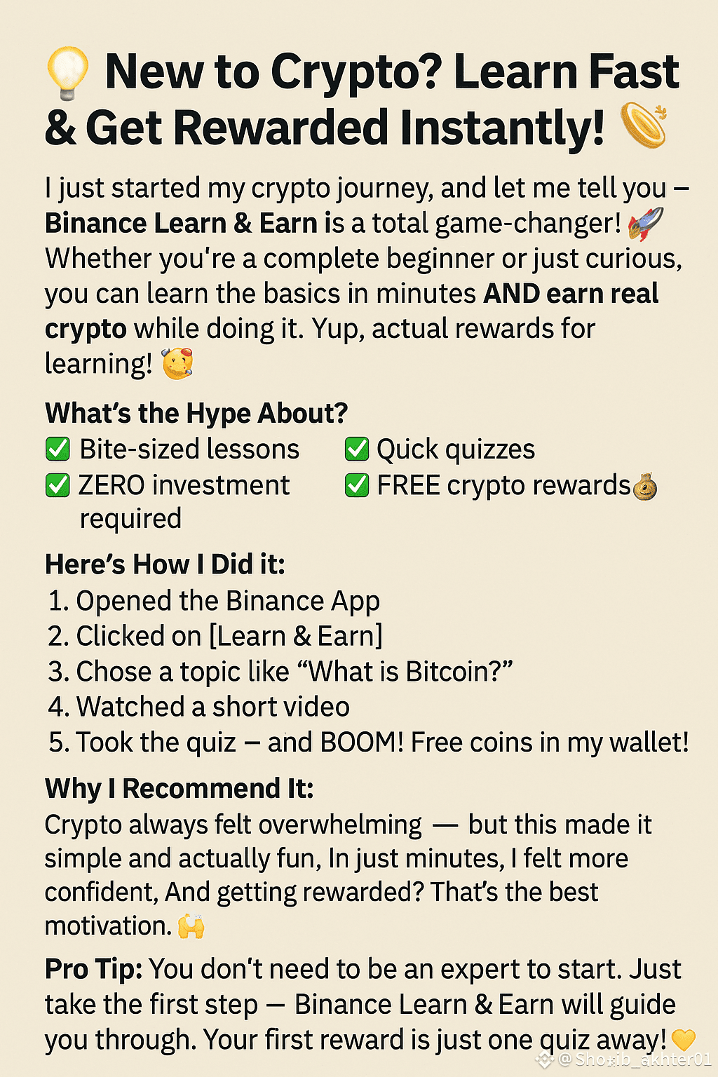 I just started my crypto journey, and let me tell you Binance Learn & Earn is a total game-changer! 🚀 Whether you're a complete beginner or just curious, you can learn the basics in minutes AND earn real crypto while doing it. Yup, actual rewards for learning! 🥳🔥