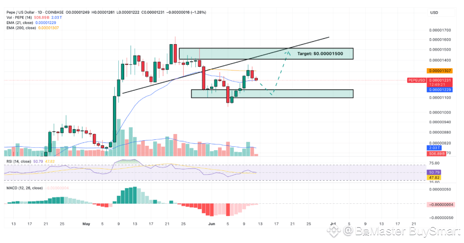 Pepe (PEPE) broke its trend line support in late May when it decisively dropped below the $0.00001300 level with strong volumes.