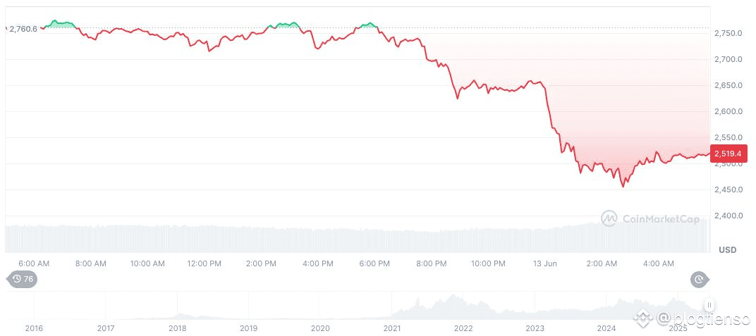 Ethereum ($ETH ) hiện đang giao dịch ở mức 2.532,42 đô la với vốn hóa thị trường là DeepBrainChain , đánh dấu mức giảm 7,38% trong 24 giờ, theo CoinMarketCap. Khối lượng giao dịch trong 24 giờ tăng vọt 36,37% lên 40.011.974.417 đô la, phản ánh vị thế thận trọng của những người tham gia thị trường. Đồng tiền điện tử này nắm giữ 9,38% thị phần thống trị trong khi thể hiện xu hướng hiệu suất hỗn hợp trong những tuần gần đây.