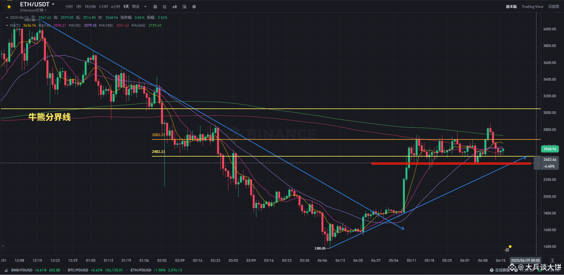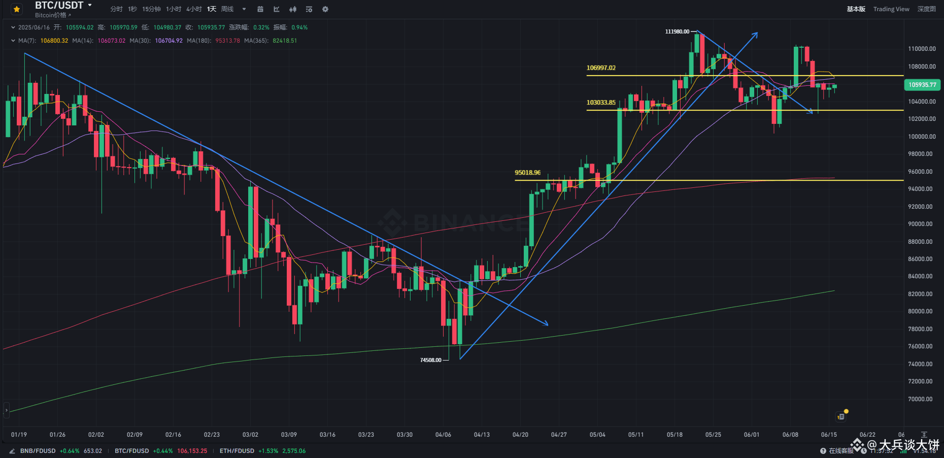 周线级别:收长上影阴线,跌破 7 周均线(105800 美元),创两月新低。17 日起美债到期虽理论释放流动性,但地缘风险或削弱资金流入。日线级别:受冲突影响下探 103000 美元,形成 “三针探底” 形态,200 日均线(102500 美元)成最后防线。上方 106500 美元(斐波那契 38.2% 回撤位)阻力强劲,需放量突破才能扭转颓势。4 小时级别:反弹量能萎缩 42%,显示抄底谨慎。日内关注 106500-107500 美元压力,104500-103500 美元支撑,破位需警惕加速下跌。