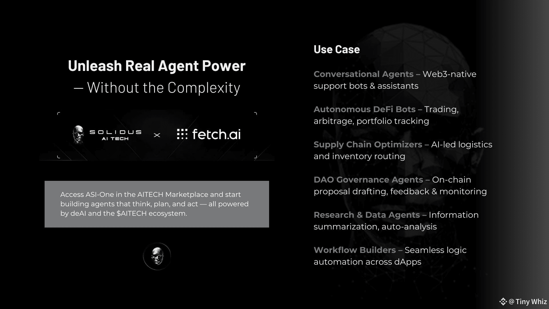 Next, how does this integration benefit AITECH AI Marketplace users? With ASI‑One live in the marketplace, you gain plug‑and‑play access to a proactive intelligence engine. You can connect it directly via API or drop it into #AgentForge —Solidus’ no‑code/low‑code agent builder—and immediately start designing agents that execute on your strategy. Whether you need a trading bot that senses market dips and rebalances your portfolio, a customer‑support agent that resolves tickets end to end, a logistics coordinator that optimises supply flows, or a governance assistant that weighs proposal data and casts votes, ASI‑One handles the heavy lifting for you.