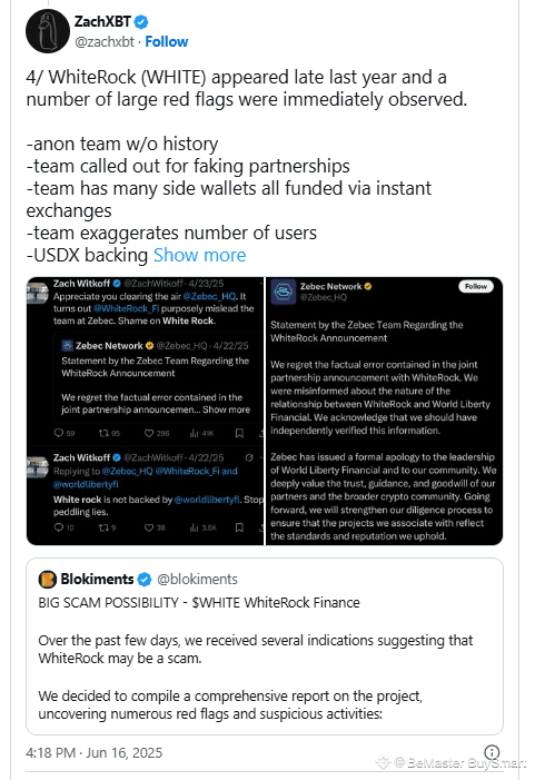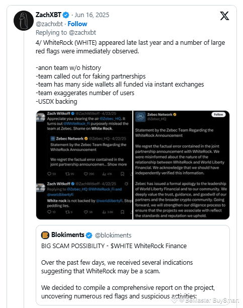 ZachXBT’s investigation reveals that WhiteRock emerged in late 2024 with immediate red flags, including an anonymous team without verifiable history, fabricated partnership claims, and funding sources linked to instant exchanges commonly used for money laundering.