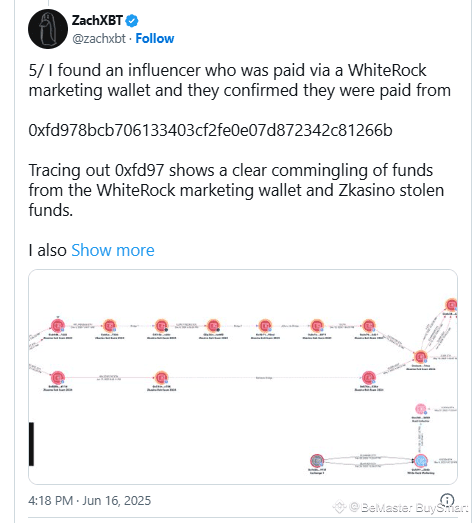 The investigator traced funds from ZKasino’s stolen treasury directly to WhiteRock’s marketing wallet, which was subsequently used to pay influencers for promotional content.