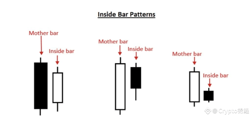inside bar形态由前面的一根mother bar(母线)和后面的一根inside bar(孕线)组成。inside bar形态有时候也会有一根mother bar和多根inside bar的现象。