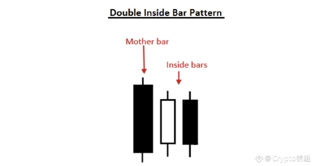 双重inside bar也就是一根mother bar紧跟着两根inside bar,这很常见,有的时候你甚至还能看到后面紧跟着3根4根甚至更多根inside bar的情况。这种形态就意味着市场当前犹豫不决的状况会继续。