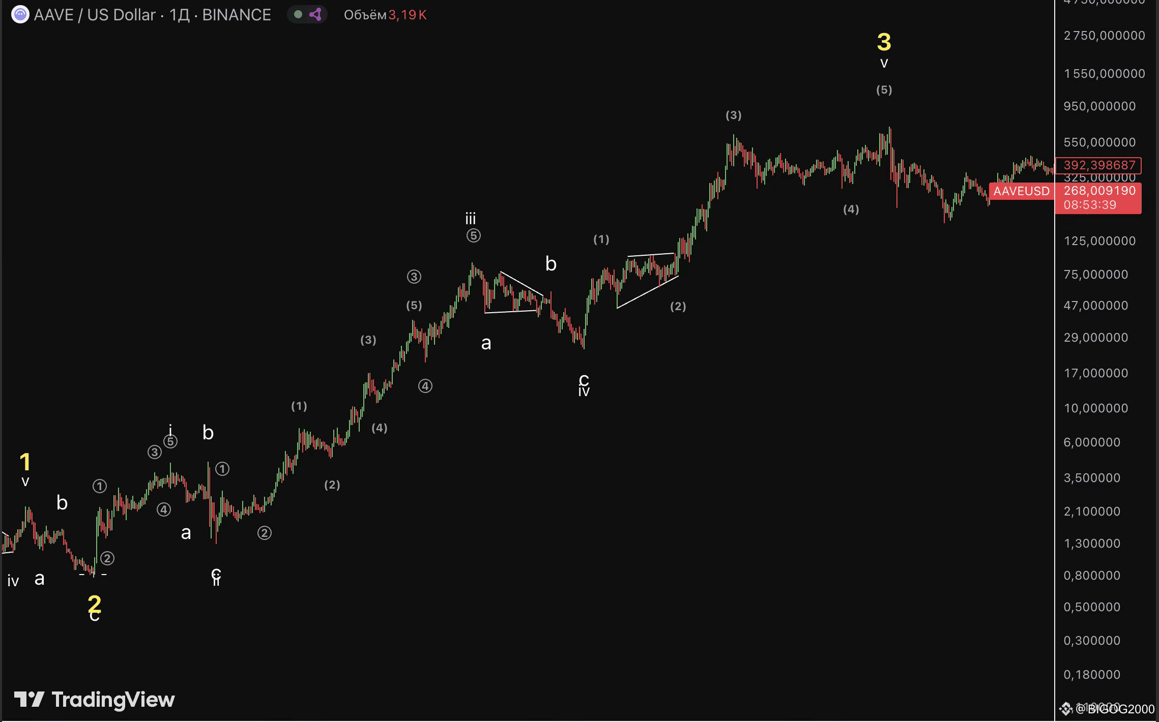 Сейчас AAVE уже давно находится в коррекции — с мая 2021, после формирования волны A треугольника. Ниже коротко пройдусь по всем основным волнам. Волна 1 была сложной и спорной. Долго не мог понять, где именно начинается подволна 1, но сильный импульс на входе и смена рыночной структуры подтверждают старт именно с этой точки. Подволна 3 — самая выраженная. После неё — сужение диапазона в виде треугольника и финальный рывок волны 5. Из подволн 3, 5 и подволн B во 2-й волне образовался паттерн "Голова и Плечи". Волна 2 — классическая коррекция. Волна А — импульс из 5 подволн меньшего уровня, В — вероятно, зигзаг или двойной зигзаг, С — импульс, почти равный по длине с волной А. Фибоначчи подтверждает структуру — волна С чётко на уровне 1 по сетке.