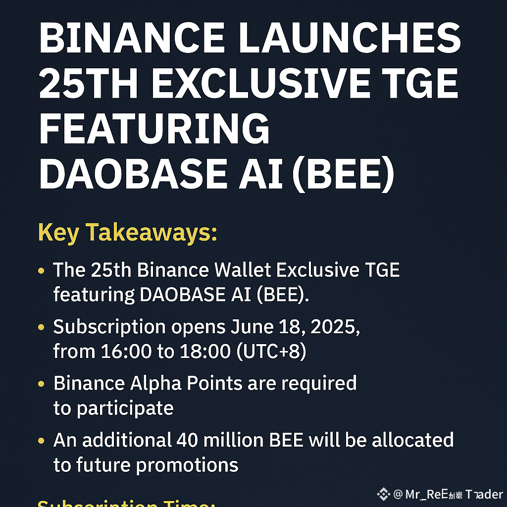 Binance is back with a power-packed TGE opportunity — and this time, it’s all about AI meets Web3! The 25th Wallet Exclusive Token Generation Event (TGE) features DAOBASE AI (BEE) — a project fusing decentralized governance with cutting-edge artificial intelligence.
