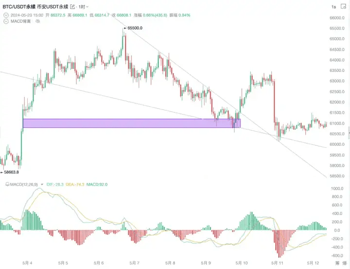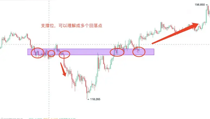 支撑位可以理解成多个回落点,形成山谷或者山峰,在山脚的地方会多次回踩。可以是一个小范围价格也可以是一个点位。我们刚刚讲的MACD背离+关键价位。关键价位就是这个支撑位有没有破。