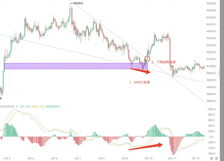 满足这两点,突破了下降趋势线,可以考虑做多。或者是我们可以在下跌趋势的前高画一条线,当价格突破了前高,这代表形成了趋势破坏。价格大概率由下跌趋势转变为上升趋势,我们可以在价格突破前高后入场做多。总之就是:关键价位+MACD趋势反转背离。