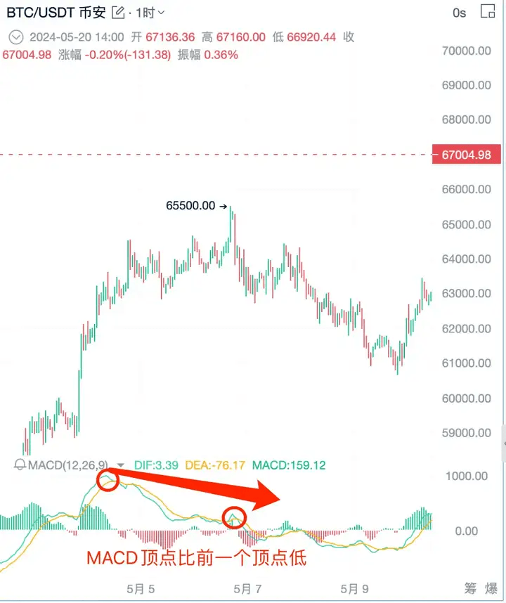 照理来说MACD也应该形成顶顶高来对应价格的趋势动能,但是,这时MACD却形成顶顶低,价格的趋势动能有减弱的迹象。图中的第二个高点比第一个更高,就是顶顶高。