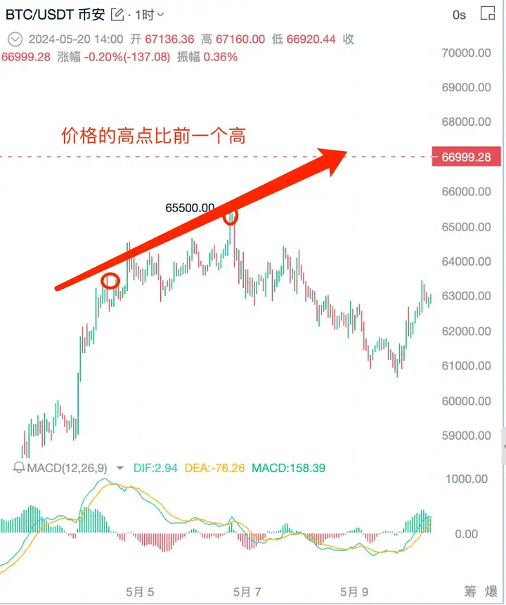 比如按照趋势标准定义,一个高点高过一个高点同时低点也高过上个低点。