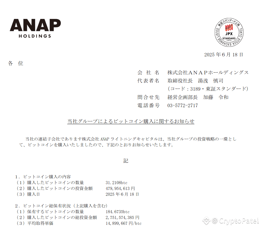 🇯🇵 On June 18, 2025, #ANAP Holdings officially announced that their group company ANAP Lightning Capital has purchased: