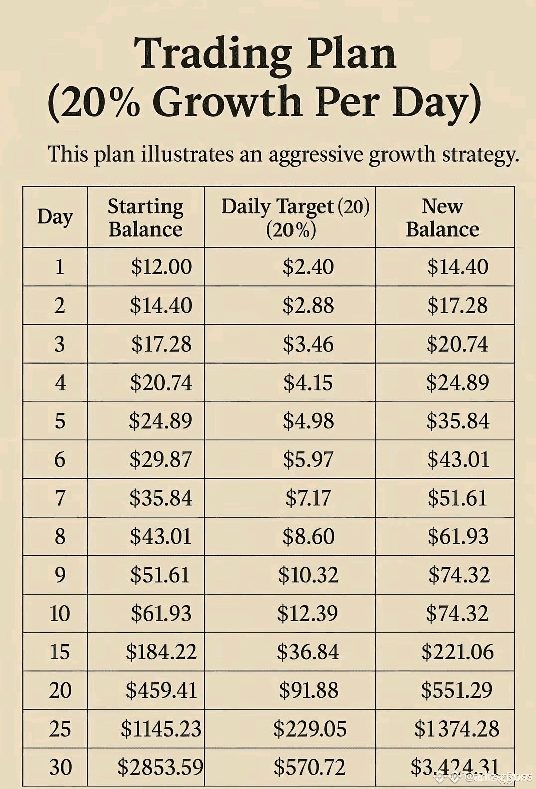 This aggressive 30-day plan shows exactly how traders can achieve that, with a focus on daily compounding at 20%.