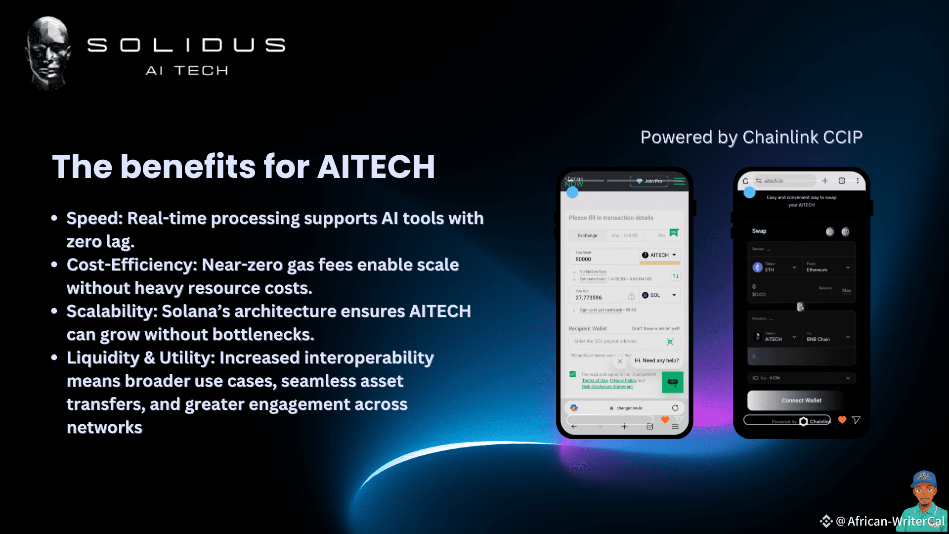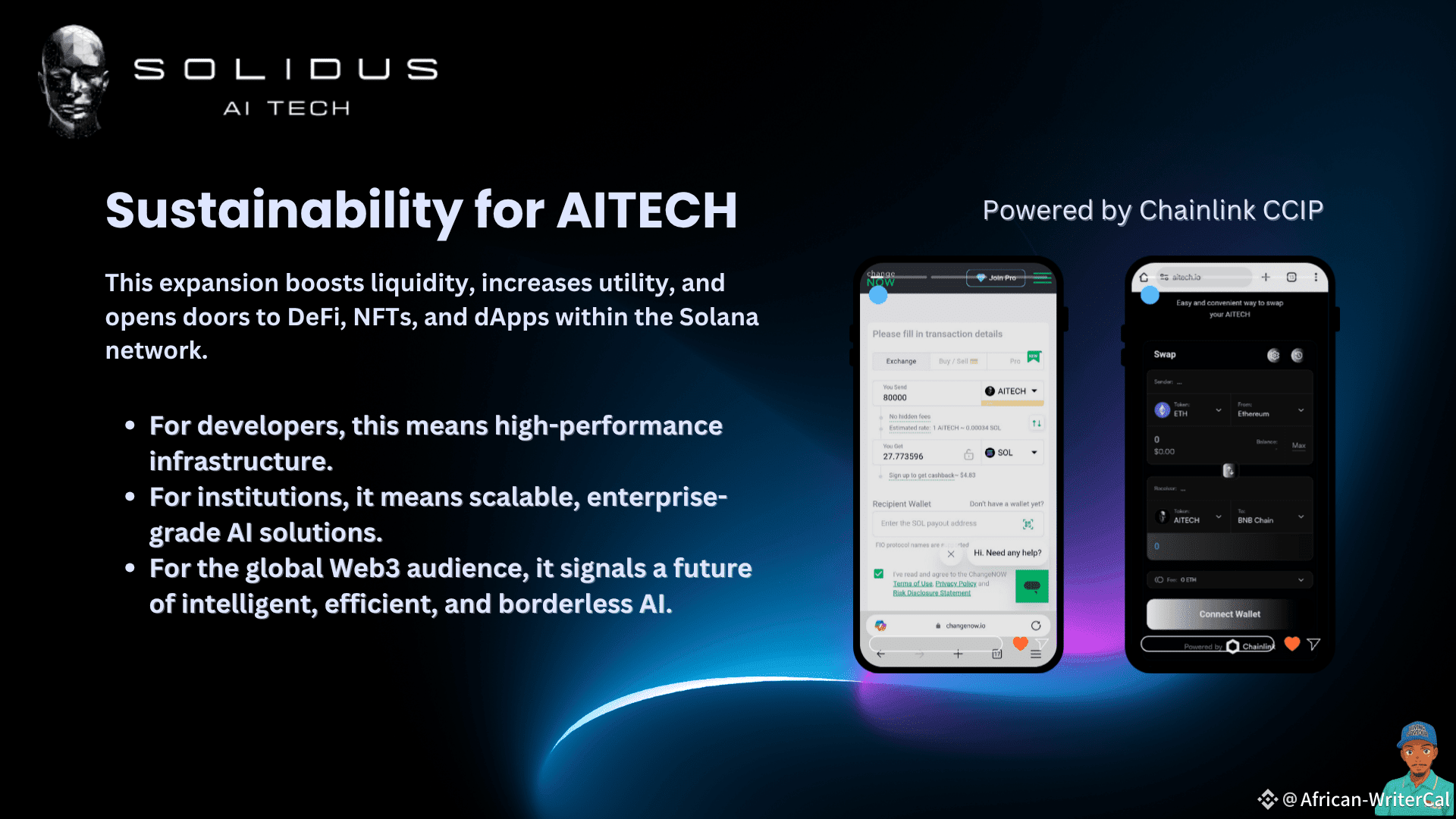 AITECH has officially begun the technical integration of its ecosystem with the Solana blockchain, utilizing Chainlink’s Cross-Chain Interoperability Protocol (CCIP) to ensure secure, scalable, and reliable bridging. This marks a major milestone in Solidus’ long-term multi-chain roadmap, designed to create a powerful, accessible AI infrastructure across the Web3 landscape.