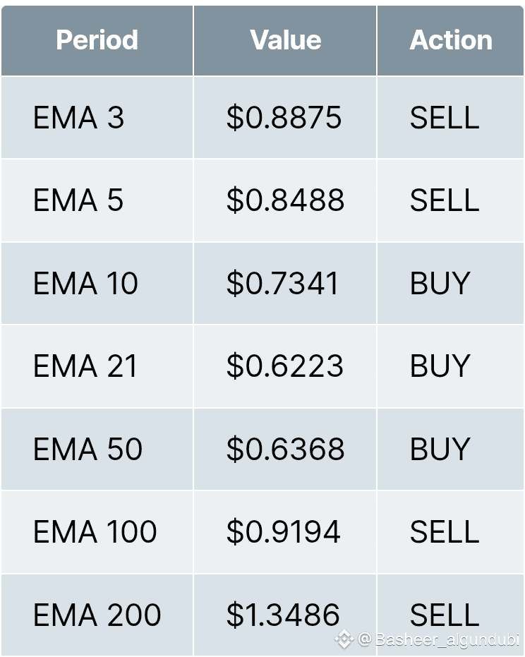 كما أن مؤشر MACD سلبي، حيث يشير كلٌّ من خط الإشارة والرسم البياني العمودي إلى الأسفل، مما يعزز موقف البائعين. يقترب السعر من منطقة دعم رئيسية عند 0.721 دولار أمريكي؛ وإذا لم يصمد، فمن المرجح أن يشهد المزيد من الانخفاض نحو 0.70 دولار أمريكي.