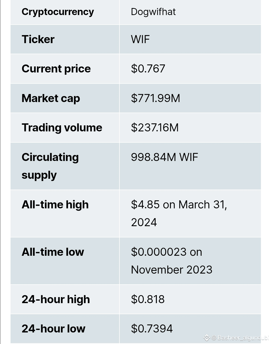 Dogwifhat ($WIF ) هي عملة Memecoin أخرى مستوحاة من الكلاب، مبنية على سلسلة كتل Solana. على الرغم من حداثتها نسبيًا في السوق (أُطلقت في نوفمبر ٢٠٢٣)، إلا أن مشروع "dog wif a hat" حقق نجاحًا ملحوظًا بعد إطلاقه.