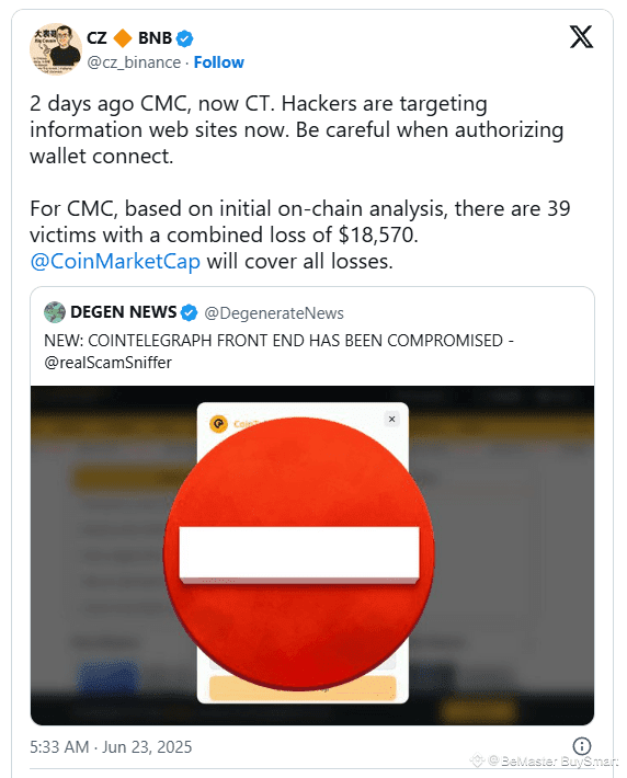 Following the attacks that hit CoinMarketCap and Cointelegraph, Binance founder Changpeng Zhao stepped in to warn users of the growing number of similar incidents in the crypto world .