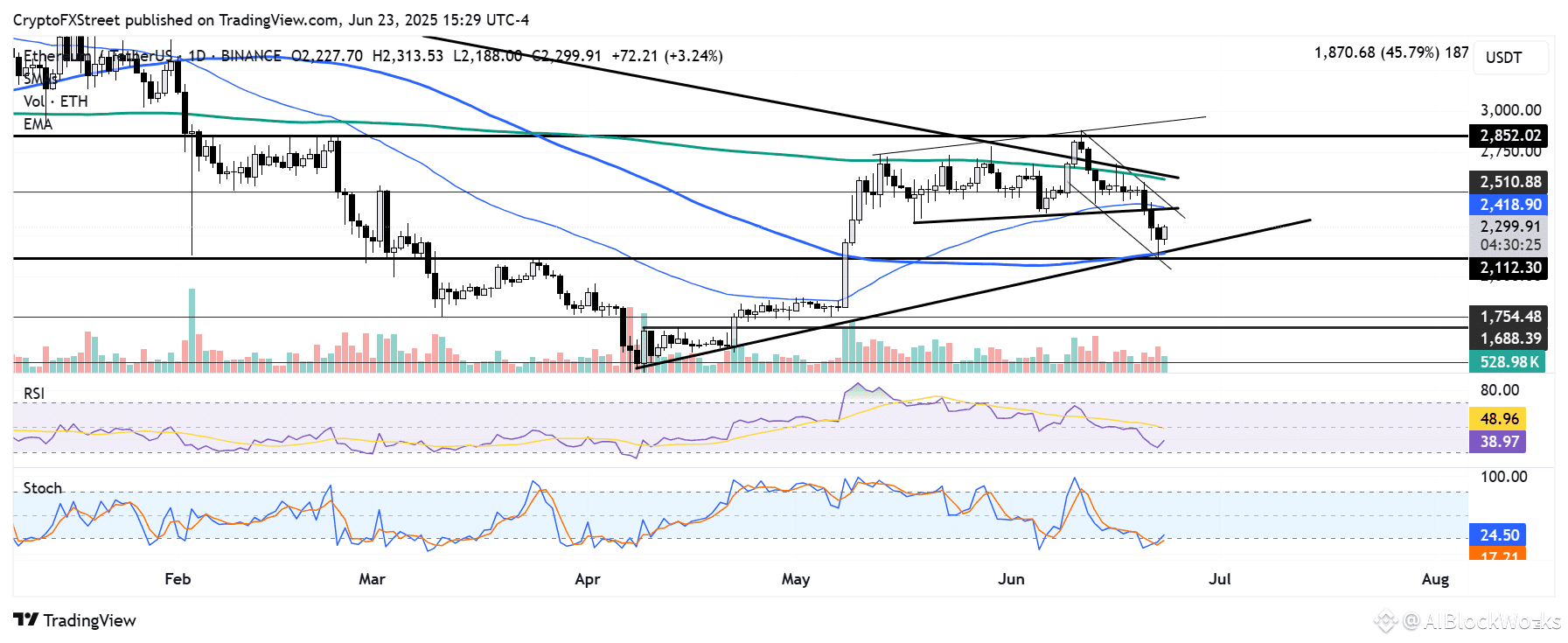 Ethereum briefly retreated from $2,300 but quickly bounced back after Iran reportedly launched missiles at a US military base in Qatar, according to Axios. The strike comes as a retaliation for the US attack on three Iranian nuclear sites over the weekend — a move that pushed ETH toward $2,100.