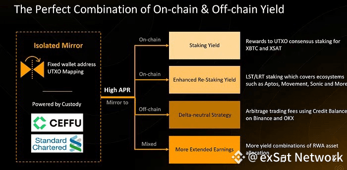 Imagine your Bitcoin as a versatile asset that can simultaneously “rest” securely in a cold wallet and “work” to generate yields in the market. Through its partnership with Ceffu, exSat introduces a Hybrid Yield Solution leveraging MirrorRSV technology. This innovative approach combines on-chain staking, enhanced restaking, and delta-neutral strategies on centralized exchanges (CEX), enabling your BTC to earn returns from both blockchains and exchange platforms without ever leaving the safety of cold storage.