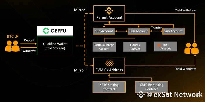 Mirroring to Binance: BTC is delegated to BTCX, injected into exSat’s master account on Binance, and allocated to sub-accounts.