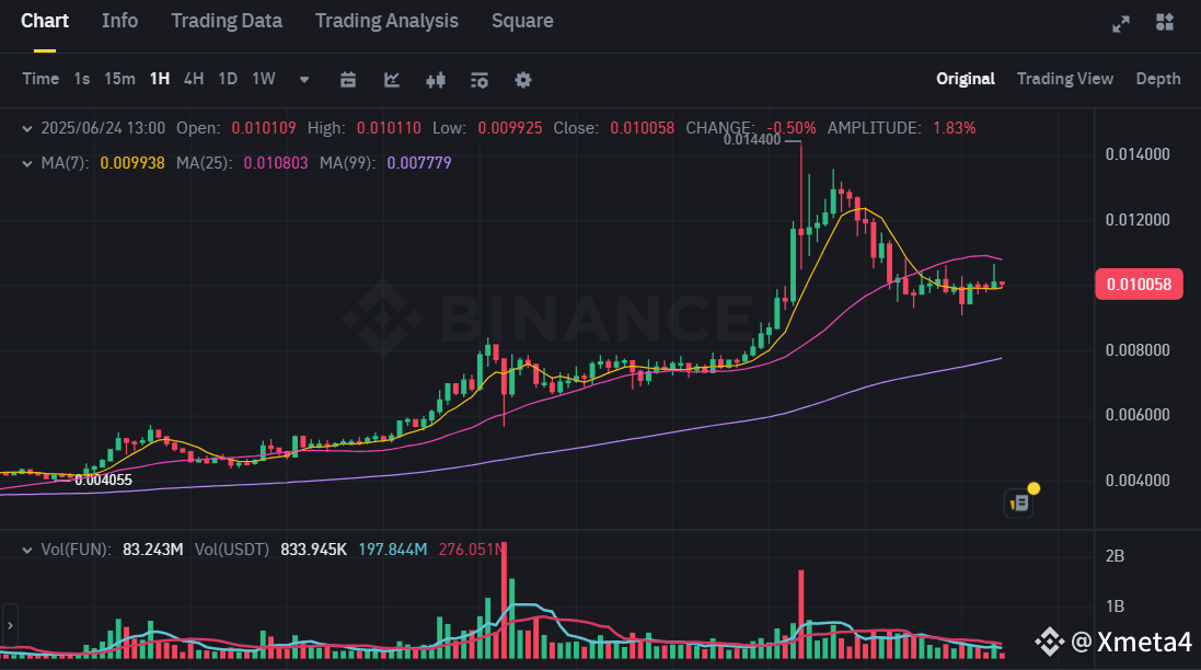 After several consecutive days of strong upward momentum, $FUN just completed a textbook parabolic rally, peaking near 0.014400 USDT before entering a much-needed consolidation. While the recent pullback may unsettle short-term traders, seasoned investors know: this pause could be the foundation for the next leg up.