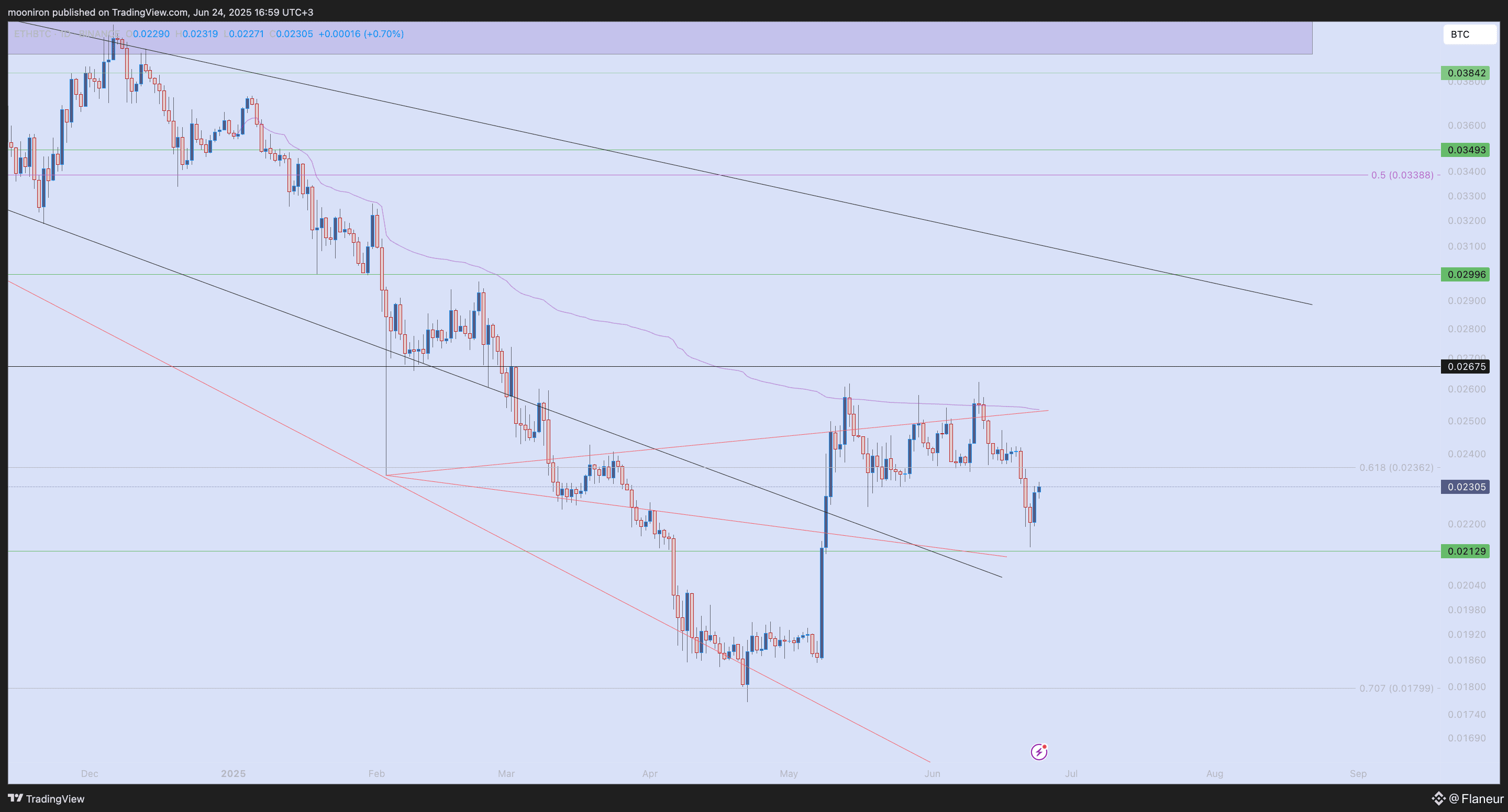 The structure of lower highs and higher lows has broken to the downside. However, it currently appears to have found support at the 0.022 region, which I have been mentioning for a long time. Since I expect sharp movements when we see a rise from here, it would be logical to include ETH in long positions. However, for a more significant position, it might be better to wait for a sustained hold above 0.026; otherwise, the trend is still downwards.