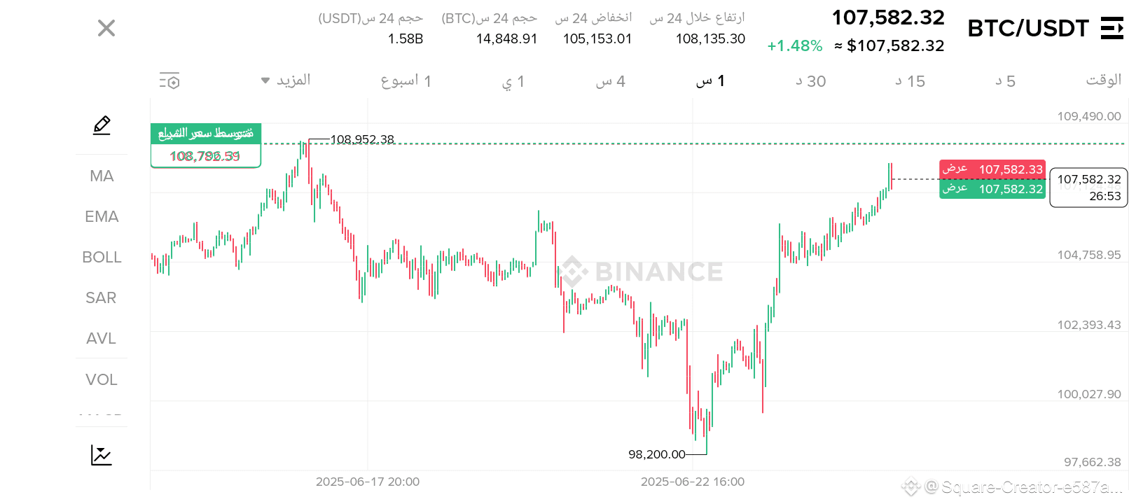 السعر حاليًا يقترب من المنطقة التي كان بها أعلى قمة (108,952)، وقد يشهد تصحيح مؤقت أو انعكاس منها.